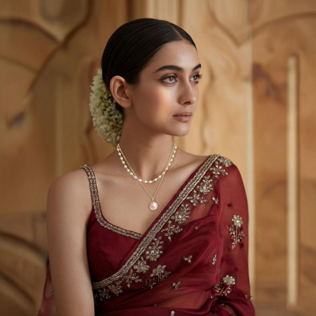 Celebrate the festive season in style with this elegant, gold-plated necklace. Featuring a graceful pearl pendant on a chic, double-layered design, it adds a touch of sophistication to any celebration. This piece is the perfect accessory to make your festive outfits shine.